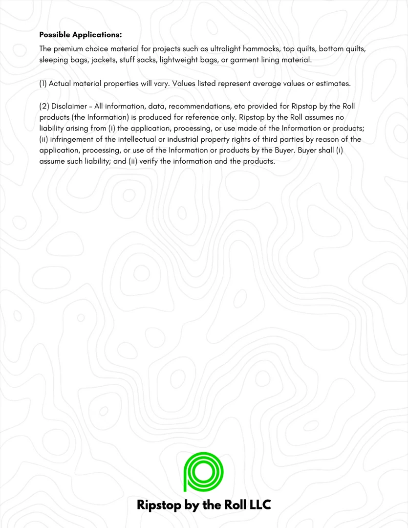 The premium choice material for projects such as ultralight hammocks, top quilts, bottom quilts, sleeping bags, jackets, stuff sacks, lightweight bags, or garment lining material.