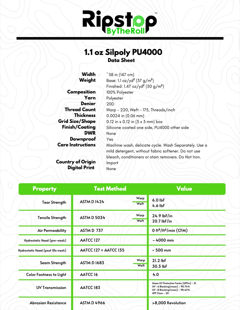 | Weight | 1.1 oz/yd2 (*~1.4 oz/yd2 with sil/PU + PU4000 coating) |