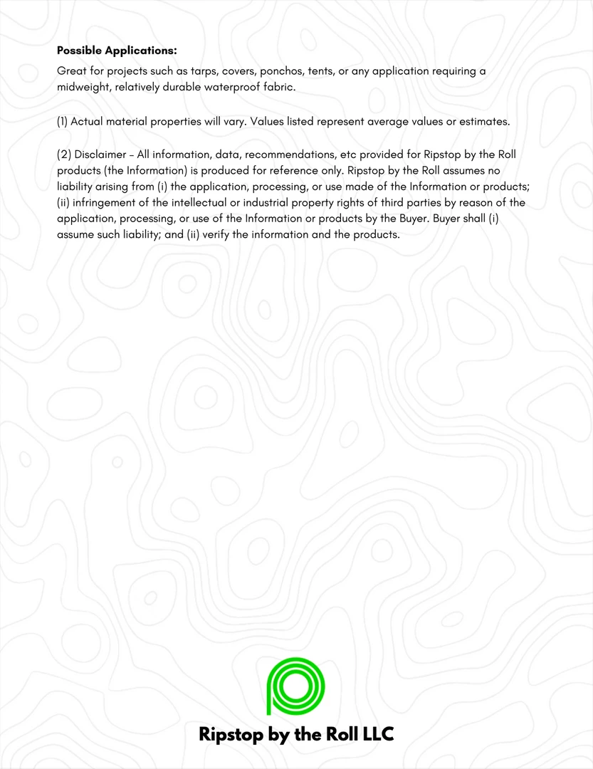 Great for projects such as tent/shelter floors, ground sheets, tarps, ponchos, gear sacks, pack covers, or any application where lightweight, highly waterproof/windproof fabric is needed.