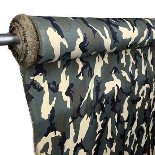 Breathable, uncalendered 1.6 oz polyester ripstop with DWR in our Woodland Camo pattern. Natural UV resistance (i.e. resists color fading), low bias stretch under load, and quick drying qualities of polyester. Specifically finished to give the softest possible hand feel for polyester.