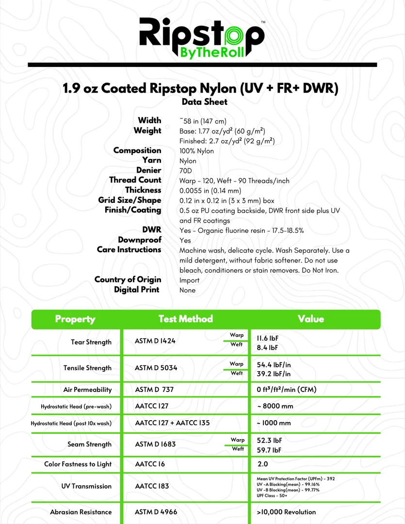 PU coated 1.9 oz (70D) ripstop nylon. This fabric has a PU (polyurethane) coating on the backside and DWR (Durable Water Repellent) front to make it waterproof.
