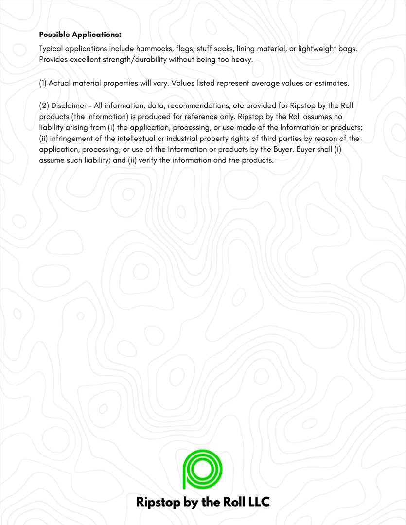 Typical applications include hammocks, flags, stuff sacks, lining material, or lightweight bags. Provides excellent strength/durability without being too heavy.