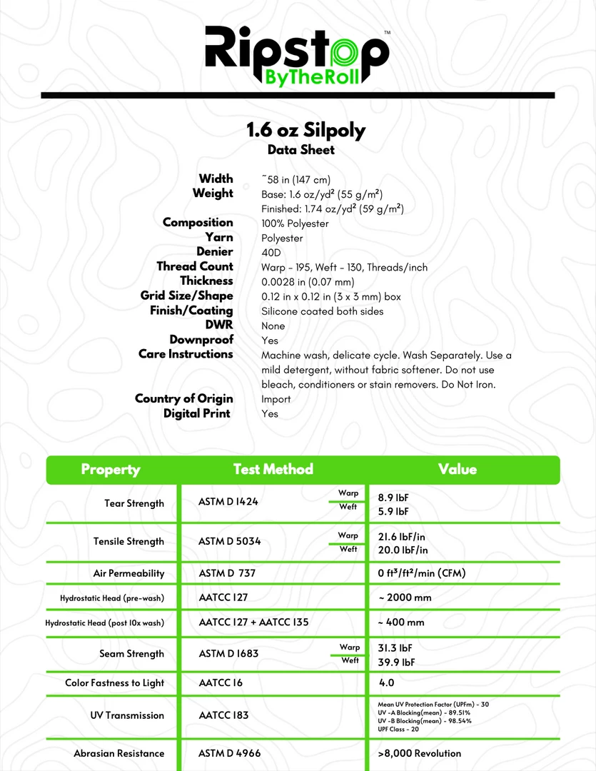 1.6 oz Silpoly offers higher strength, lower bias stretch, and better puncture/abrasion resistance than our lightweight 1.1 oz Silpoly and ultralight Membrane Silpoly. Best used when you prefer a more robust material over the absolute lightest weight.