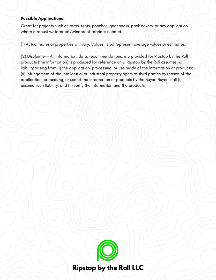 Same silpoly benefits of lower water absorption and increased UV resistance compared to Silnylon. Great for projects such as tarps, tents, ponchos, gear sacks, pack covers, or any application where a robust waterproof/windproof fabric is needed.